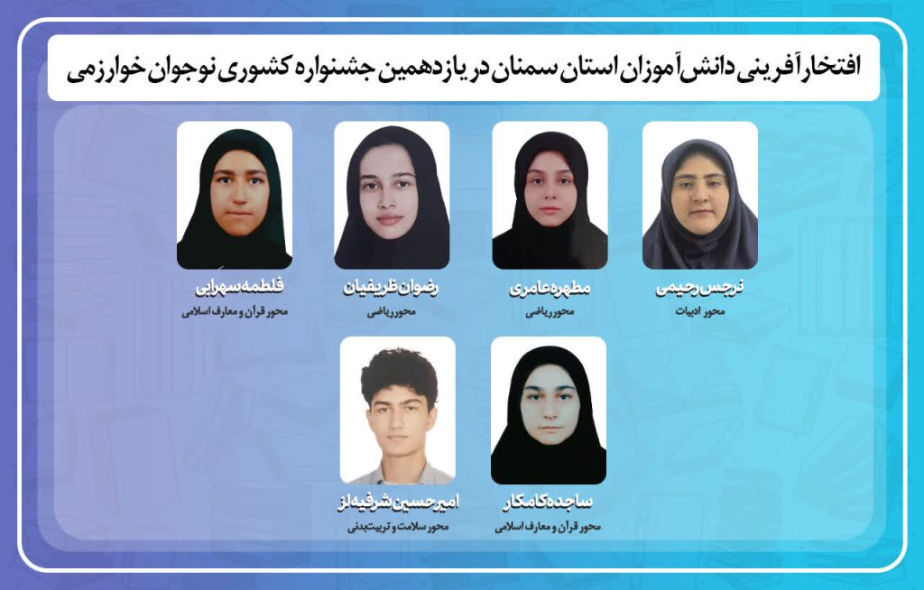 معاون آموزش و پرورش استان سمنان اعلام کرد: کسب رتبه اول کشوری در محور «ریاضیات» توسط رضوان ظریفیان و مطهره عامری از شهرستان شاهرود و کسب رتبه اول کشوری در محور «ادبیات» توسط نرجس رحیمی از شهرستان شاهرود از جمله موفقیتهای دانش آموزان استان سمنان است.